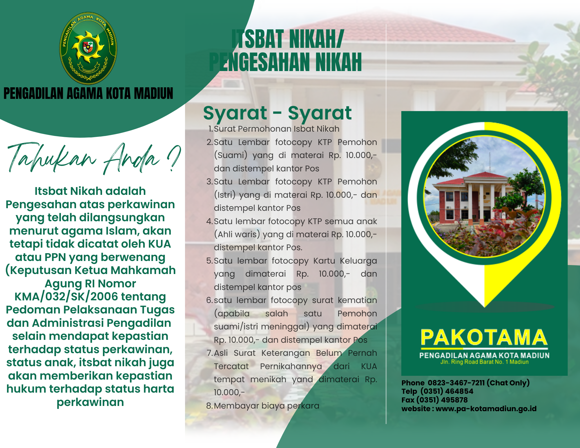 Persyaratan administrasi Isbat Nikah di Pengadilan Agama Kota Madiun adalah: